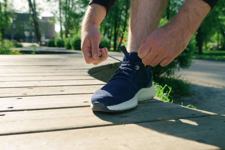 Man tying running shoes in the park outdoor, male runner ready for jogging on the road outside