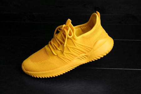 Stylish yellow sneaker on black wooden background