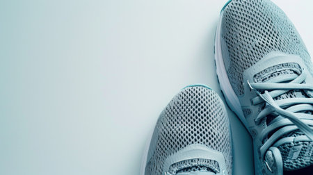 White sports sneakers isolated on a blue background, doing sports and training in the hall, healthy lifestyle, top view, copy space