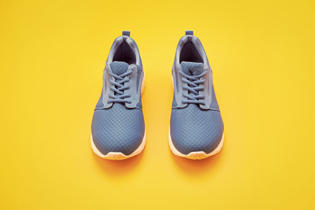Pair of classic blue sneakers or gumshoes with white shoe laces on a textured bright yellow background. Comfortable shoes for fitness and sport. Top view.