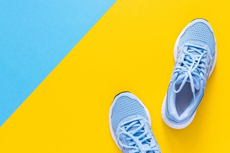 Blue female or male sneakers on yellow paper background. Flat lay. Top view. Minimal background. Fashion blog or magazine concept. Copy space. Trendy
