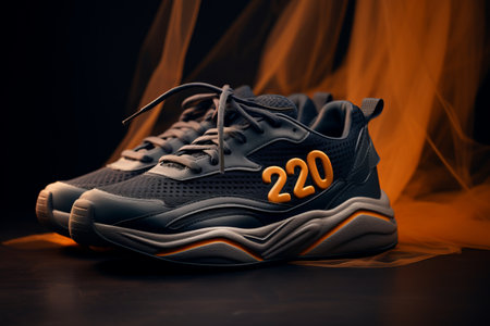 Stability and cushion running shoes. New unbranded running sneaker or trainer on orange background. Men's sport footwear. Pair of sport shoes.