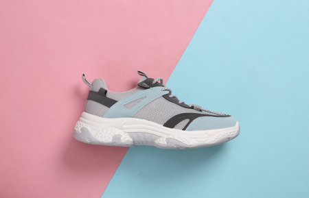Sports sneakers on a blue-pink pastel background. running shoes. pastel color trends