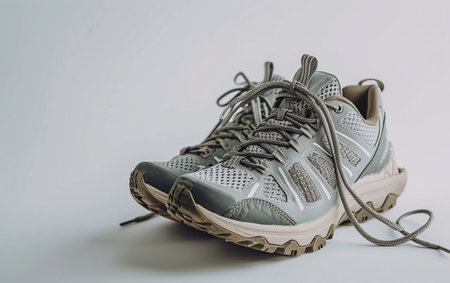 Sports sneakers with flying laces on gray background