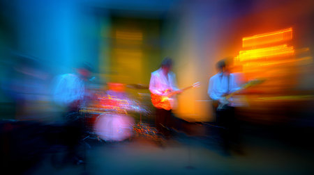 Colorful abstract blur of band rehearsal in motion, guitars, drums, and lights blending together