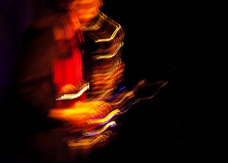 Jazz music concept. Abstract motion blurred image of saxophone player performing on stage. Sax player going crazy.