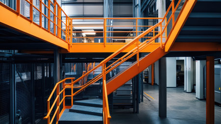 A captivating view of a modern industrial staircase featuring bright orange railings, set within a spacious warehouse, showcasing contemporary design and functionality.