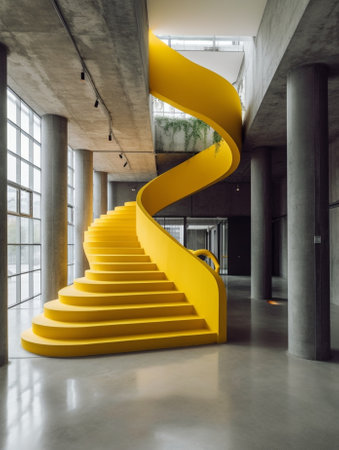 Spiral staircase in building with yellow and blue spiral design on it. Generative AI.