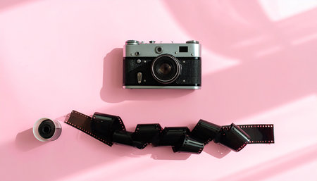 A vintage camera is prominently displayed on a wooden surface, accompanied by a film roll and another camera in the background.