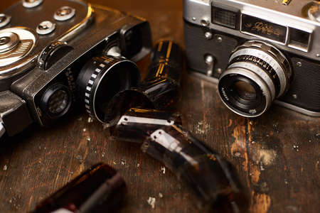 Film old cameras with lenses and manifested film on a white wooden background with copy space.