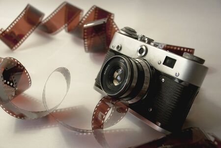 Vintage analog camera for movie making with filmstrip isolated on gray backgrpound.