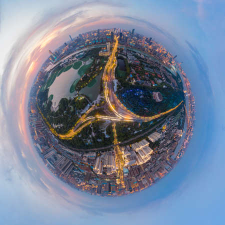Little planet 360 degree sphere birds eye view. Panoramic view of Hong Kong Downtown. Financial district and business centers in smart city in Asia. Top view of skyscraper and high-rise buildings.