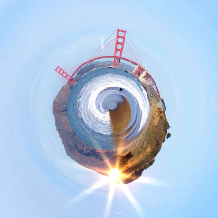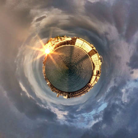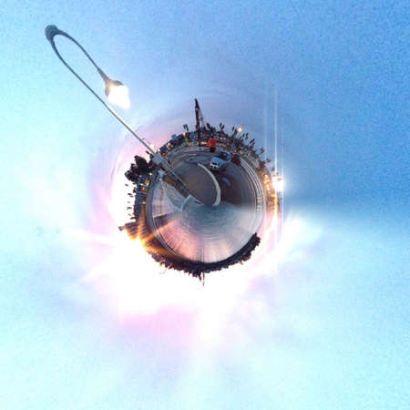 Blue little planet. Inversion of tiny planet transformation of spherical panorama 360 degrees. Spherical abstract aerial view. Curvature of space.