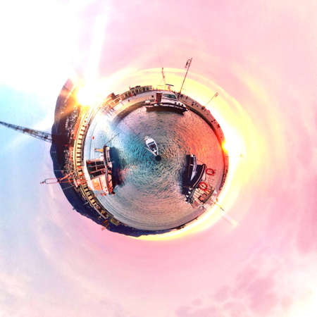Circular cityscape surrounding a body of water with ships under a bright sunset sky view