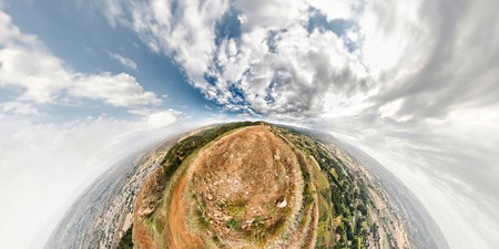 Abstract panoramic aerial view in a forest and field with fantastic beautiful clouds and curvature of space like a small planet
