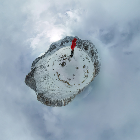 Spherical panorama of a lonely man standing in the mountains.