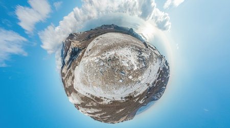 Winter snow mountain panorama. 360 little planet panorama aerial view above sea and snow covered frozen mountains with deep blue sky and a beautiful radiant sun. Cold weather and climate change
