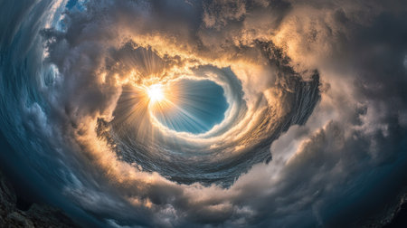 Dramatic vortex forming underwater, captured from below with light rays piercing through the surface