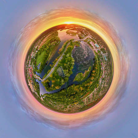 Spherical 360 degrees panorama of sunrise over landscape with fields and green grass. Little planet panorama