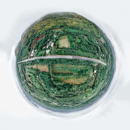 Little planet 360 degree sphere. Panorama of aerial view of national park green field mountains in Thung Yai Naresuan Wildlife Sanctuary, Umphang District in Tak, Thailand. Wildlife, trees.