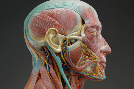 A precise 3D anatomical side-profile render showing detailed muscle fibers, nerves, and cranial structures. Designed with medical-level for educational and artistic visualization.