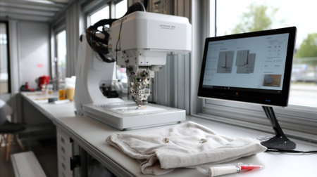 Inside the robotailor van a robotic arm expertly stitches fabric together in a smooth precise motion while a digital screen shows the customization options selected by the customer