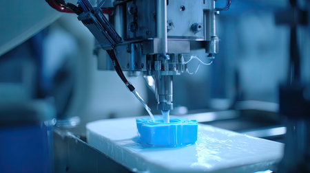 Liquid is precisely applied onto a metal surface by a high-tech machine, showing an advanced manufacturing process in a dimly lit workshop.