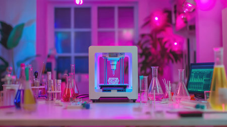 Modern laboratory showcasing a 3D printer in action, surrounded by beakers, test tubes, and a digital screen.