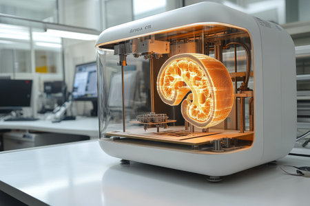 Inside a modern laboratory, a cuboid 3D printer showcases a partially constructed human kidney. The intricate design highlights innovations in bioprinting technology for medical applications.