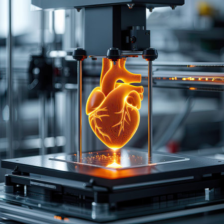 A close-up view of a 3D printer creating an artificial heart model, featuring intricate details and vibrant colors, showcasing advancements in medical technology.