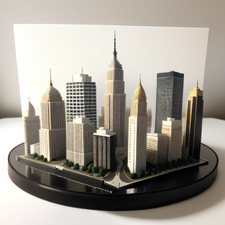 A detailed indoor display of a cutting-edge, digitally crafted city with soaring, intricate towers showing innovative design and manufacturing techniques.
