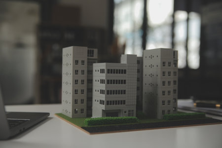 Modern architectural model of high rise buildings on wooden table with blurred background in bright office