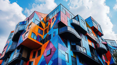 A vibrant and modern building with a unique abstract geometric design and balconies, showcasing a colorful and eye-catching architectural style.