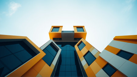 This image showcases a modern building featuring vibrant orange windows illuminated against a blue sky. The striking contrast highlights contemporary design.