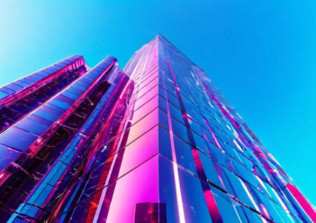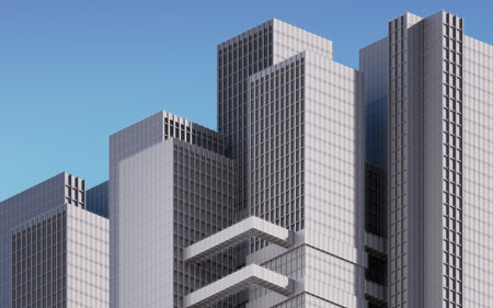 A striking capture of a modern architectural corner showcasing sleek lines and geometric precision set against a clear blue sky, embodying contemporary design aesthetics.