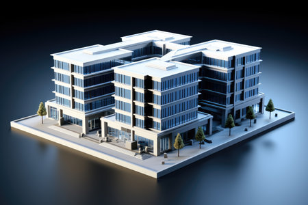 3d render of modern building in isometric projection on black background, 3d model of building architecture, AI Generated