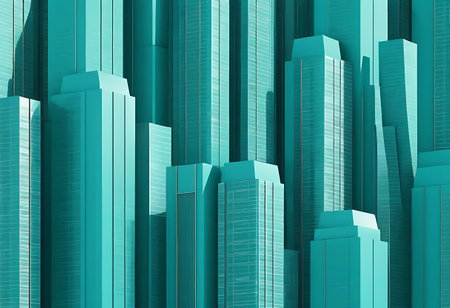 Close up on a teal glass skyscraper showing the corner detail against a solid teal sky. The building design is layered with angled and sharp corners, repetitive structure.