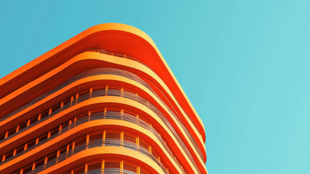 This striking image showcases a modern building featuring a unique curved architecture in bright orange tones. The clean lines and blue sky create an engaging visual experience.