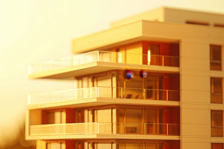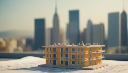 A detailed yellow model of a three-story apartment building with blue doors and white balconies sits on of architectural blueprints. In the background, a blurred city skyline with tall skyscrapers is visible under a hazy sky.