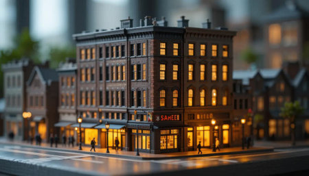 This stunning miniature urban building model features intricate details and warm light illumination, capturing the essence of city life and artistry in a charming display.