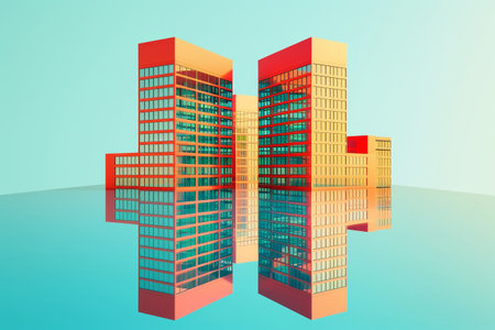 This dynamic representation showcases various architectural styles in an urban setting, highlighting a mix of residential and commercial buildings. The structures feature bold colors and distinct materials, creating an engaging visual contrast against a bright blue sky.