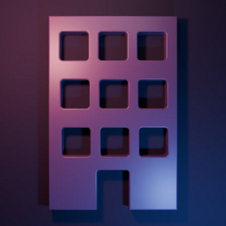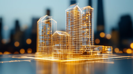 Architectural visualization of modern cityscape with illuminated buildings and blurred urban background. Concept of urban planning, architecture, real estate development.