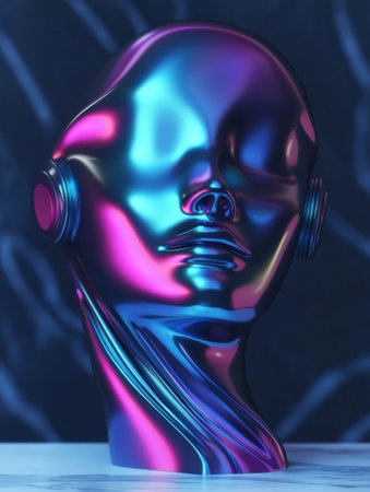 A cutting-edge metallic sculpture exudes an iridescent glow with tones of blue, purple, and pink. its futuristic design is set against a dark abstract background, creating a captivating visual contrast.