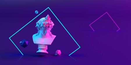 Purple pink antique sculpture on a retro vaporwave background. Contemporary art collage.