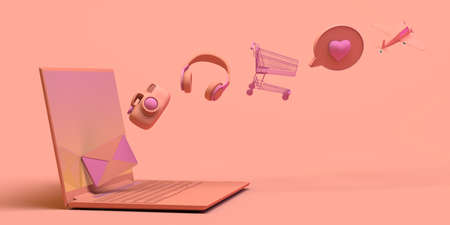 Laptop concept with floating objects. Banner. Headphones, shopping cart, games, alarm clock, messages, email ... 3D illustration. Copy space. App.