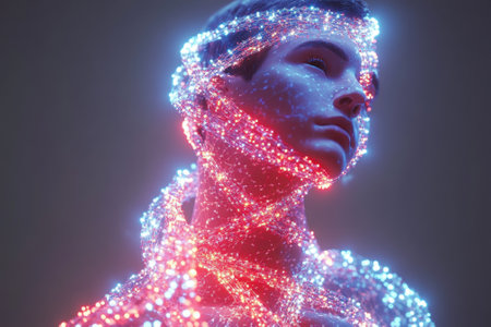 Human code, man emerging from glowing digital mesh of light and data