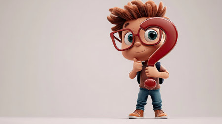 A charming cartoon character with glasses and a backpack stands confidently with a question mark, symbolizing curiosity and adventure in a vibrant and engaging style.