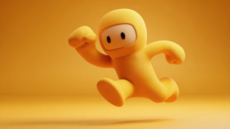 A level up mascot jumps and punches the air in celebration, showcasing excitement and joy in a bright yellow studio setting during daytime.