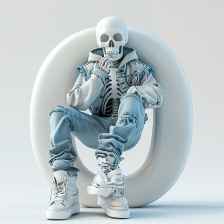 Skeleton sitting on the letter O. 3D illustration. White background.