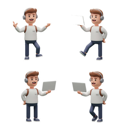 cartoon character is playing a portable console. Boy plays a video game, 3d render